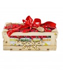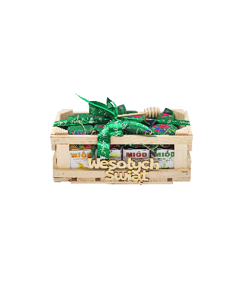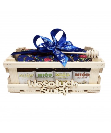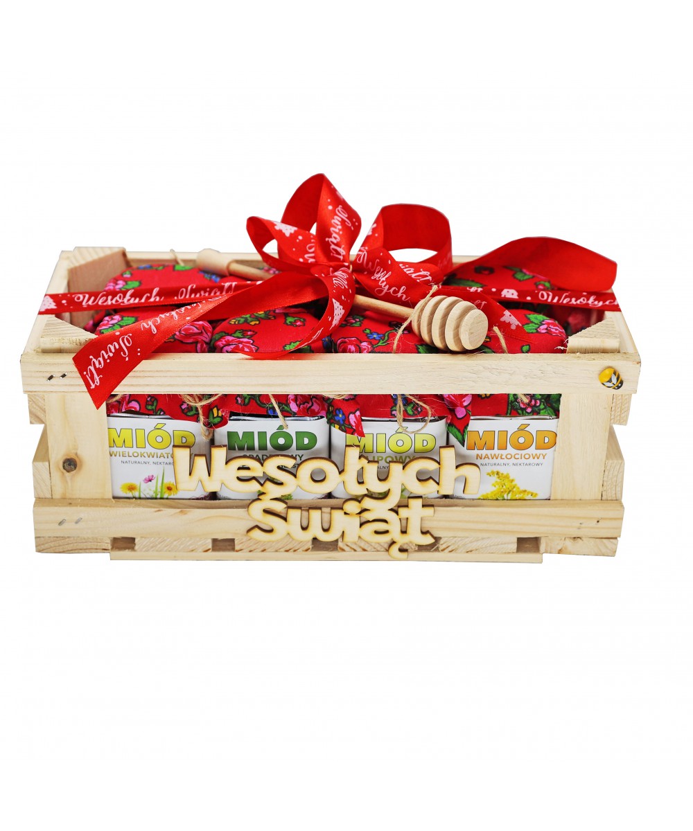 Całość spakowana w drewnianej skrzynce z drewnianym napisem „Wesołych Świąt” i zawiązana ozdobną wstążką. Drewniana pałeczka do nakładania miodu gratis.