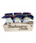 Całość spakowana w drewnianej skrzynce z drewnianym napisem „Kochanemu Tacie” i zawiązana ozdobną wstążką. Drewniana pałeczka do nakładania miodu gratis.
