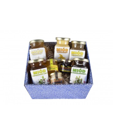 Zestaw zawiera 8 naturalnych miodów – 5 po 250g oraz 3 po 50g.