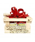 Całość spakowana w drewnianej skrzynce z drewnianym napisem „Wszystkiego Najlepszego” i zawiązana ozdobną wstążką. Drewniana pałeczka do nakładania miodu gratis.